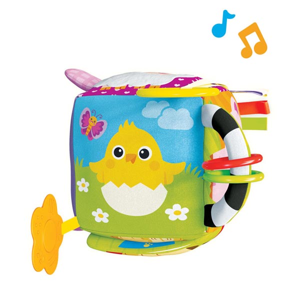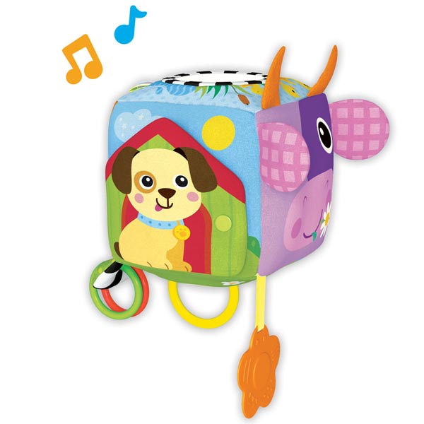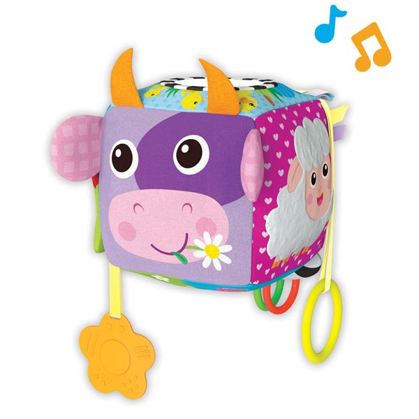 Мягкий музыкальный кубик – отличная развивающая игрушка для малышей первого года жизни. Он мягкий и легкий, изготовлен из приятного на ощупь текстильного материала. Кубик звучит при движении – играя с ним, малыш сможет послушать песенку про ферму и еще 15 звуков и мелодий ("Песенка про кузнечика", "Чижик-пыжик" и т.д.) На каждой стороне кубика изображена зверюшка фермы с "сюрпризом". Разные фактуры ткани, вшитые ленточки, колечки развивают тактильные ощущения. Шуршалки и безопасное зеркальце привлекают внимание, а прорезыватель помогает зубкам расти. Благодаря удобной подвеске кубик легко прикрепить к коляске и кроватке.