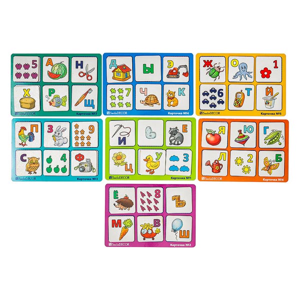 - Игра "Лото". Выберите карточку для каждого игрока, спрячьте все фишки в мешочек. Ведущий вытягивает по одной фишке из мешочка, называя букву или цифру. Игрок, у которого на карточке есть такая же буква или цифра, забирает фишку и закрывает соответствующее "окошко".