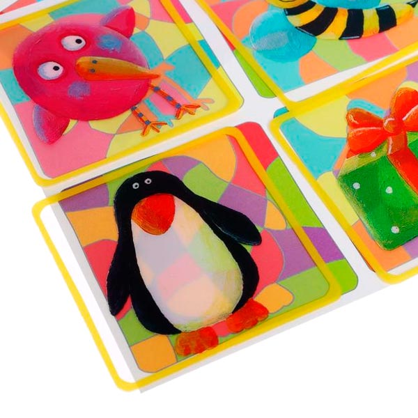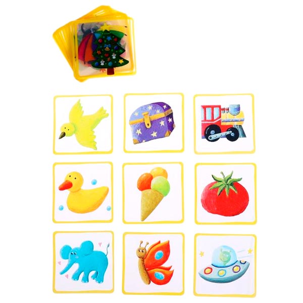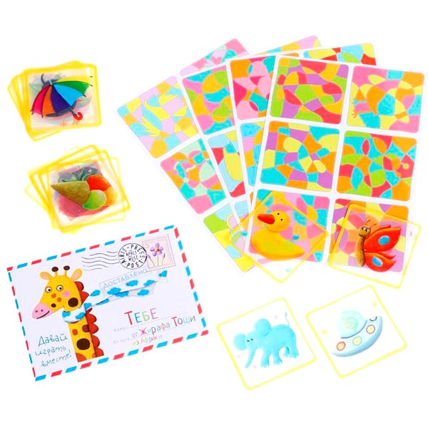 На картах-основах представлены разноцветные витражи, в которых "спрятаны" различные предметы. Малыш должен догадаться, какой предмет скрыт на рисунке, и подобрать карточку с его изображением.