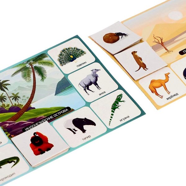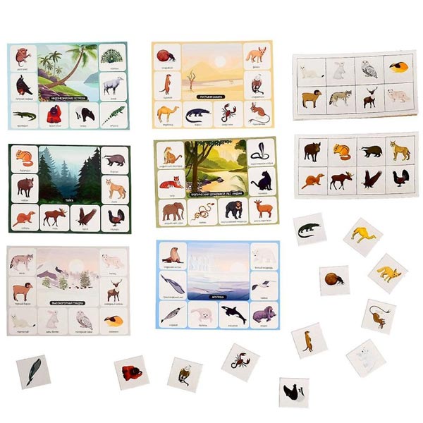 Развивающее лото "Кто где живёт?" поможет малышу запомнить животных, птиц и узнать, где они обитают. Каждое игровое поле имеет свою тематику. Карточки обозначают зоны: лес, степь, тайга, тундра, пустыня и Арктику. Маленькие карточки разделяют животных и птиц по местам обитания в природе.