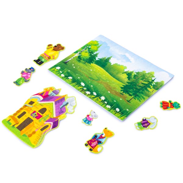 Фигурки крепятся к игровому полю с помощью липучек "велькро" – их можно перемещать по фетровой сцене, прикрепляя к тем или иным локациям.
