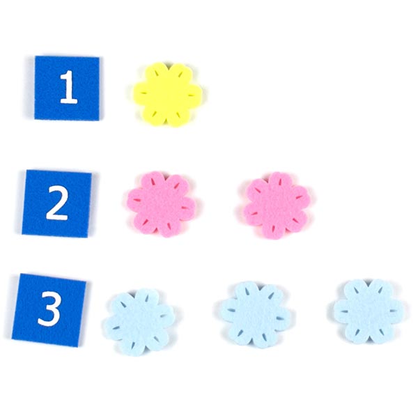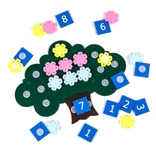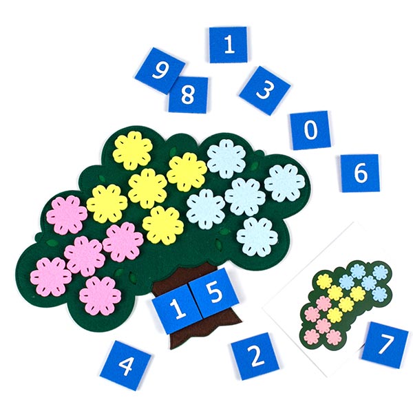 Игрушка представляет собой игровую основу в форме дерева, комплект фигурок цветов и набор цифр на липучке, карточки со схемами.