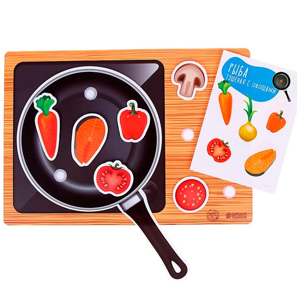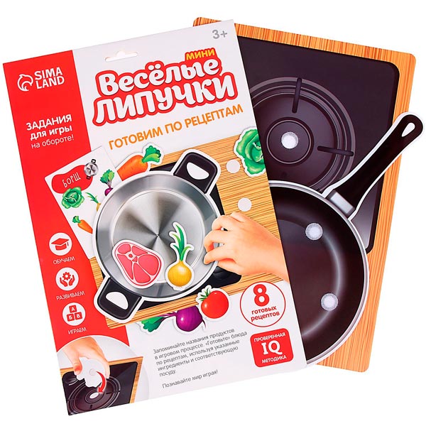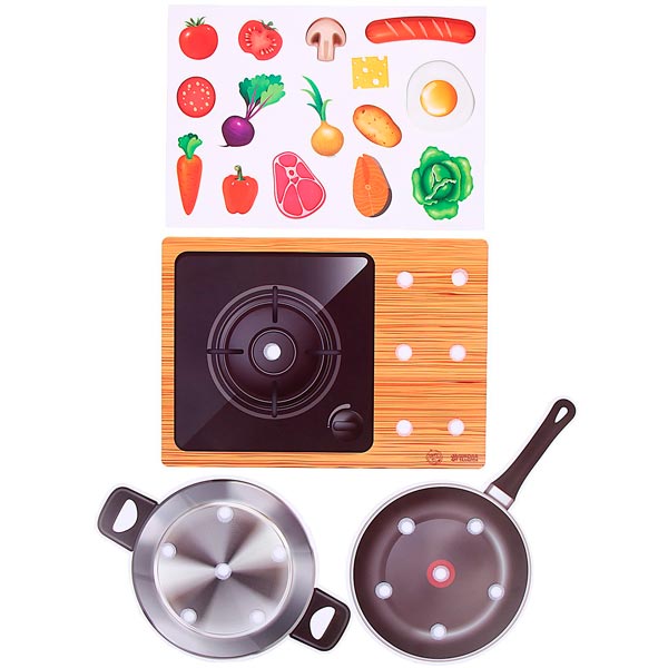 В набор входит: овощи на липучках, сковорода и кастрюля, а также 8 карточек с рецептами.