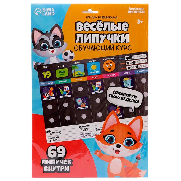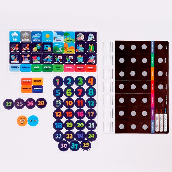 Набор включает в себя основу с полями и 69 деталей, которые помогут ребёнку планировать свои дни.