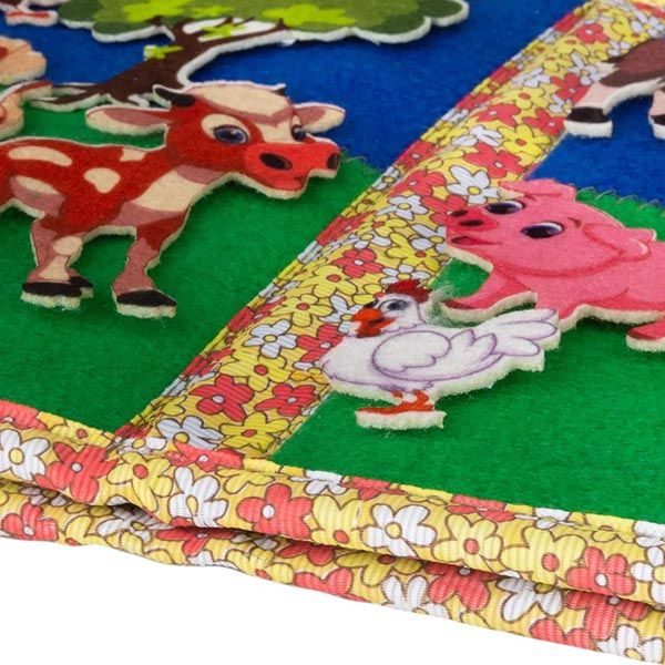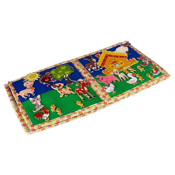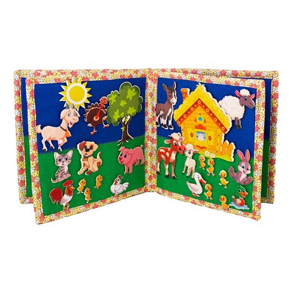 Состав: книга 20х20см, домик, собака, лошадь, жеребенок, курица, цыплята, петух, гусь, гусенок, утка, утенок, свинья, коза, овца, ягненок, корова, теленок,ослик, кролик, кошка, индюк, дерево 3шт., солнце 2шт., яблочко 5шт., листики 5шт.