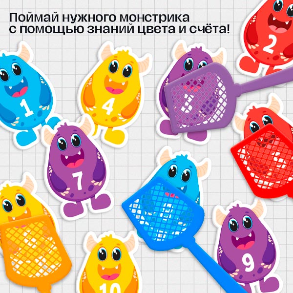 - С помощью хлопушек малыш поймает всех монстриков, используя знания цветов и навыки счёта.