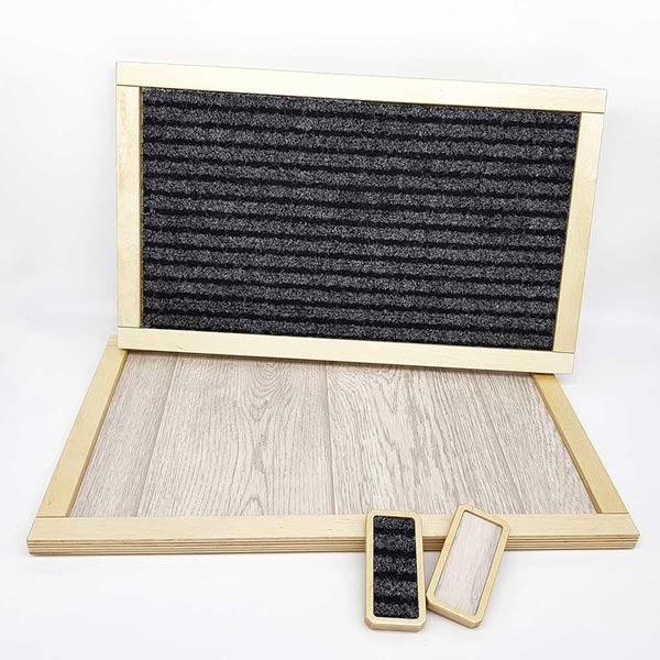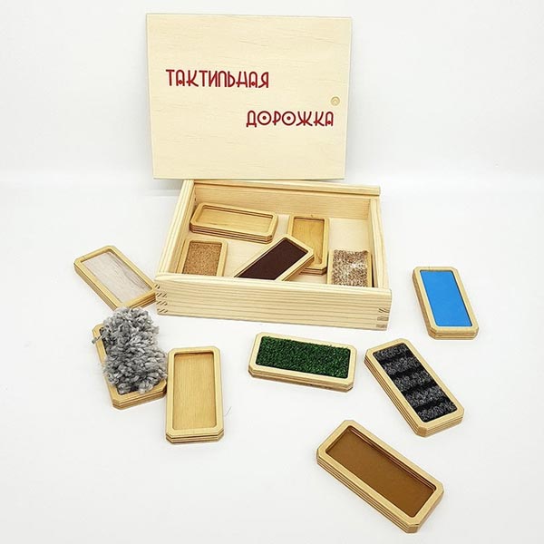 Составная сенсорная дорожка из 10 модулей на деревянной основе. На 9 элементах нанесены различные на ощупь фактуры: пробковое дерево, ламинат, наждачная бумага, ковер с высоким ворсом, искусственный газон, фольга, ковролин (мягкий и гладкий), ковролин (жесткий и рельефный), поролон; один элемент пустой, на него можно нанести любую фактуру, или заполнить его удобными материалами (крупа, песок и т.д.) Элементы выстраиваются в единую дорожку, обучая ребенка в игровой форме отличать различные модули на ощупь.
