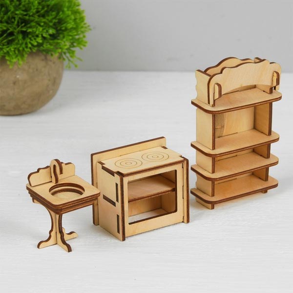 Набор изготовлен из экологически чистого и безопасного материала - березовой фанеры, толщиной 3 мм, собирается по принципу шип-паз. Детали собираются между собой в пазы, как конструктор, без клея. Игрушка абсолютно безопасна, все края гладкие и ровные. После сборки у вас получится кухня, ее можно раскрасить карандашами или красками. Конструктор продается в разобранном виде.