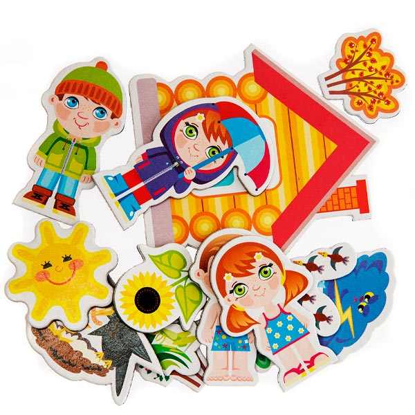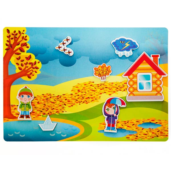 В процессе игры ребёнку нужно самостоятельно создать историю по сюжету на игровом поле, подобрав необходимые атрибуты. Малыш познакомится с временами года, научиться понимать, чем зима, весна, лето и осень отличаются друг от друга, а яркие цвета деталей игры и оригинальное исполнение обязательно увлекут Вашего малыша и подарят много положительных эмоций!
