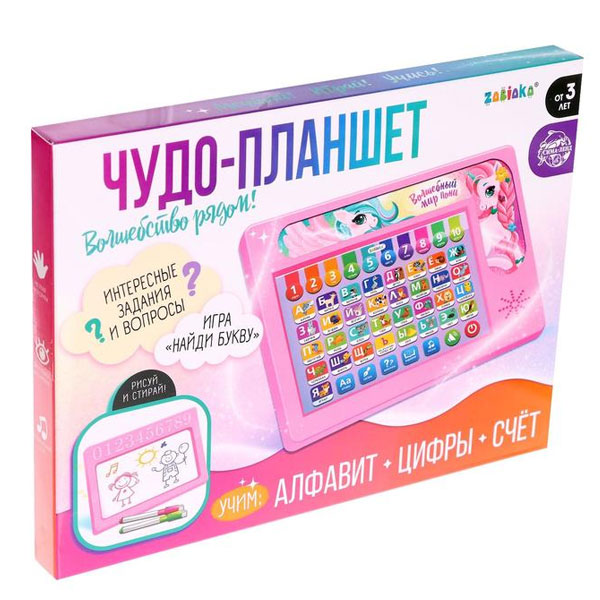 Обучающий планшет поможет малышу получить базовые знания в игровой форме: изучить алфавит, цифры, начать считать. Полезные задания, игры и вопросы помогут ребёнку освоить и закрепить полученный материал.