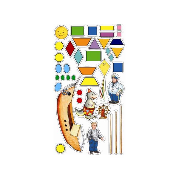 Игра "Волшебная геометрия" состоит из большого картонного поля и набора наклеек, на поле изображено море с небольшими островками. В набор наклеек входит лодка, капитан, помощник капитана и динозаврик, который может жить на одном из островов, а также множество геометрических фигур различных форм, цветов и размеров.