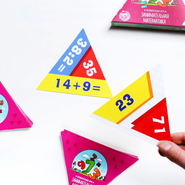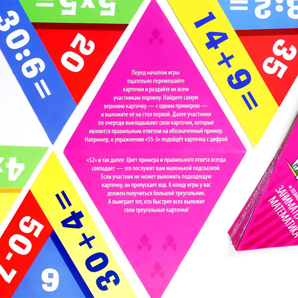 - Если участник не может выложить подходящую карточку, он пропускает ход. К концу игры у вас должен получиться большой треугольник. А выиграет тот, кто быстрее всех выложит свои треугольные карточки!
