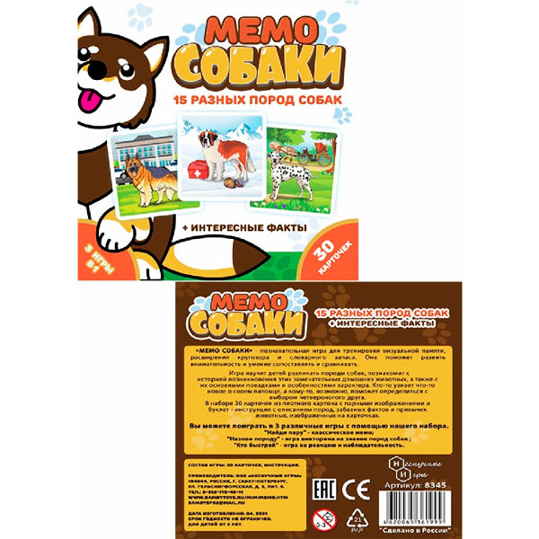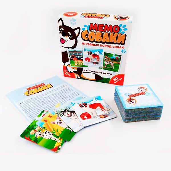 В наборе у вас будет 30 толстых карточек из картона с изображением собак разных пород. А в брошюре вы найдете интересные факты о каждой породе собак с карточек, а также три варианта игры на разный возраст.