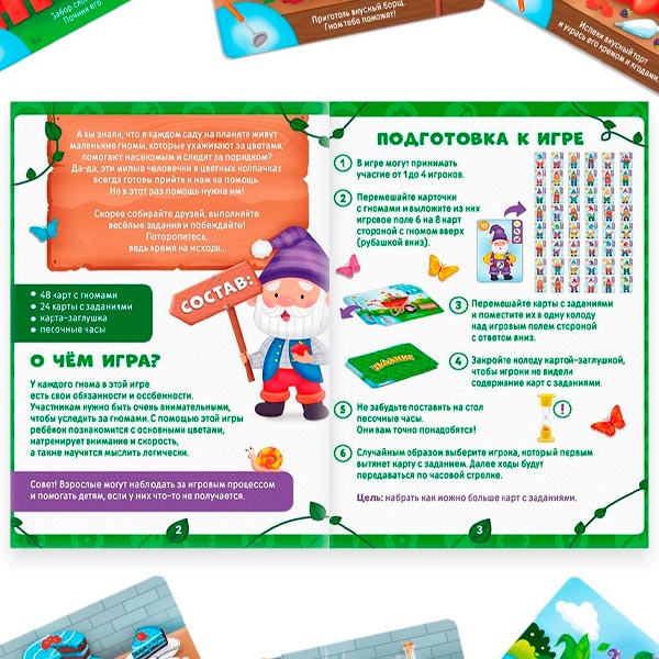 "Гномы в саду" – это развивающая настольная игра для юных исследователей, которая превращает обучение в увлекательное приключение! В волшебном саду живут веселые гномы разных цветов, профессий, и ваша задача – найти нужных гномов и выполнить задание на карточке, тренируя при этом внимание, скорость реакции и логическое мышление.