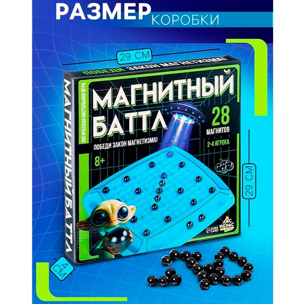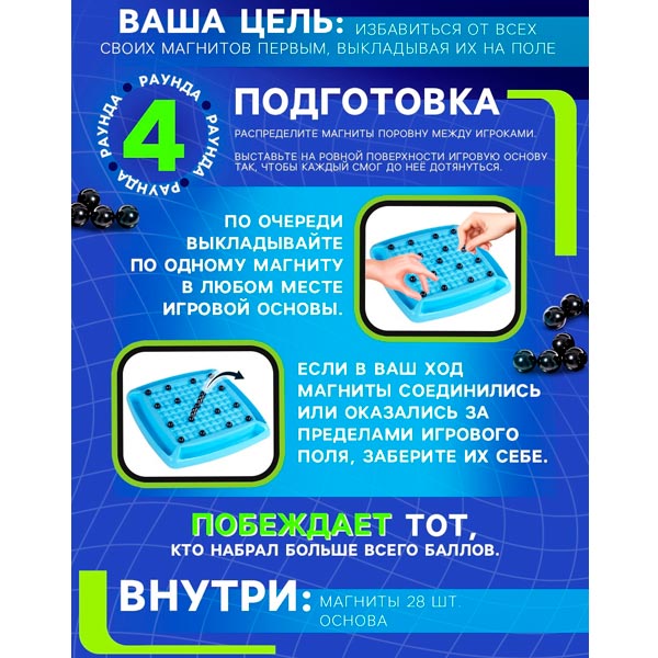 "Магнитная битва" — настольная игра для детей от 8 лет. Малышу предстоит проявить сообразительность и избавиться от всех своих магнитов первым. Увлекательная настолка подойдёт для компании от 2 до 4 игроков и поможет с пользой провести время.