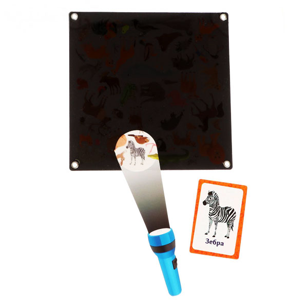- Игроки переворачивают карточку из колоды и начинают искать животное на своём игровом поле с помощью волшебного фонарика.