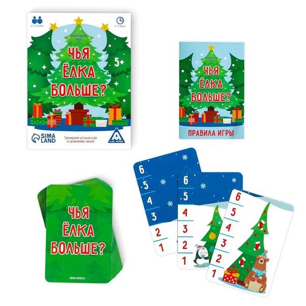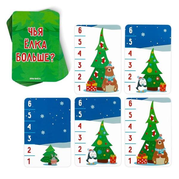 Внимание! На каждой карте с ёлочкой есть цифра. Когда вы переворачиваете карточки и определяете самое высокое дерево, проговаривайте, что, например, цифра 6 больше, чем цифра 5. И так далее. Так вы в лёгкой игровой форме сможете повторить с ребёнком счёт и сравнение чисел.