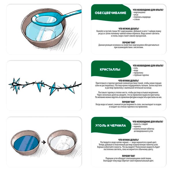 Вместе с ребёнком выберите карточку с опытом. На одной её стороне прописаны все составляющие, процесс опыта и что должно получиться. Есть научное объяснение, почему так происходит. На другой стороне карточки нарисована картинка, изображающая процесс проведения опыта или его результат.