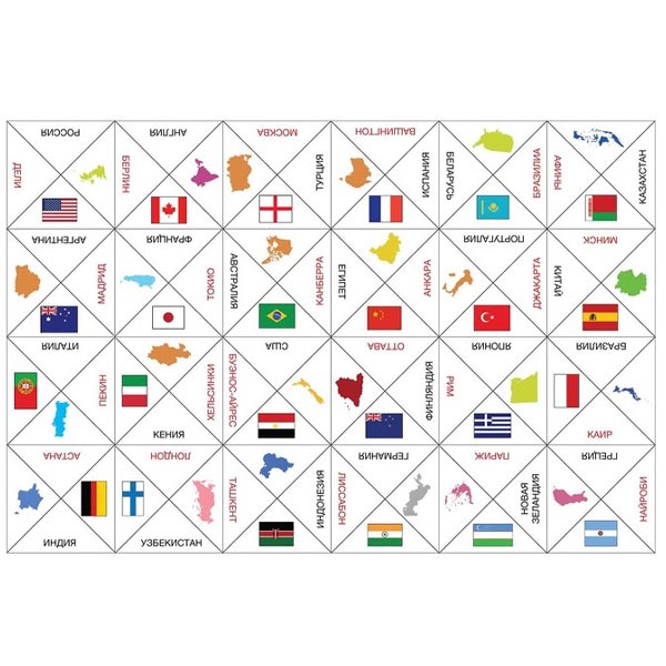 Внутри вы найдёте 25 карточек со странами и их флагами, столицами и контурами.