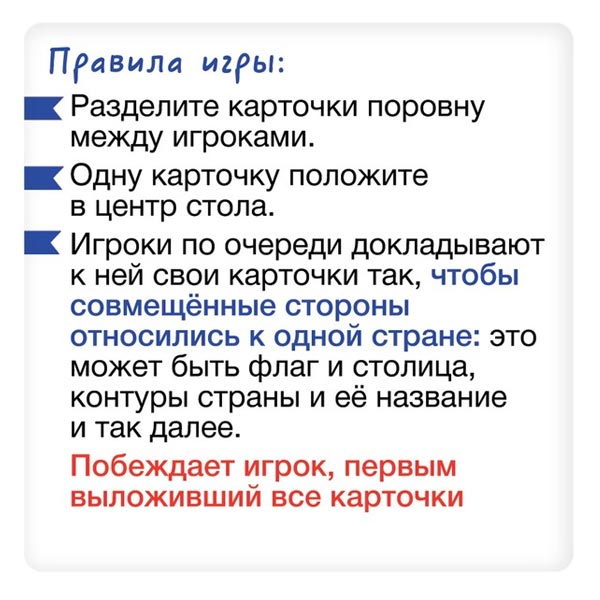 - Игроки по очереди докладывают к ней свои карточки так, чтобы совмещённые стороны относились к одной стране: это может быть флаг и столица, контуры страны и её название и так далее.