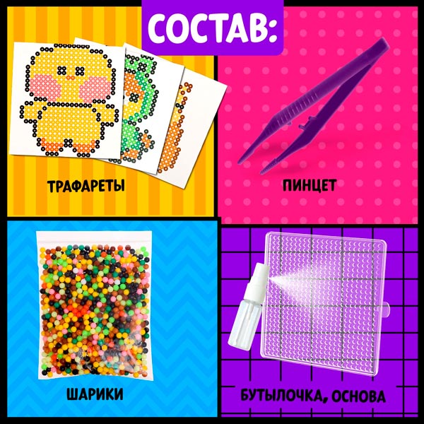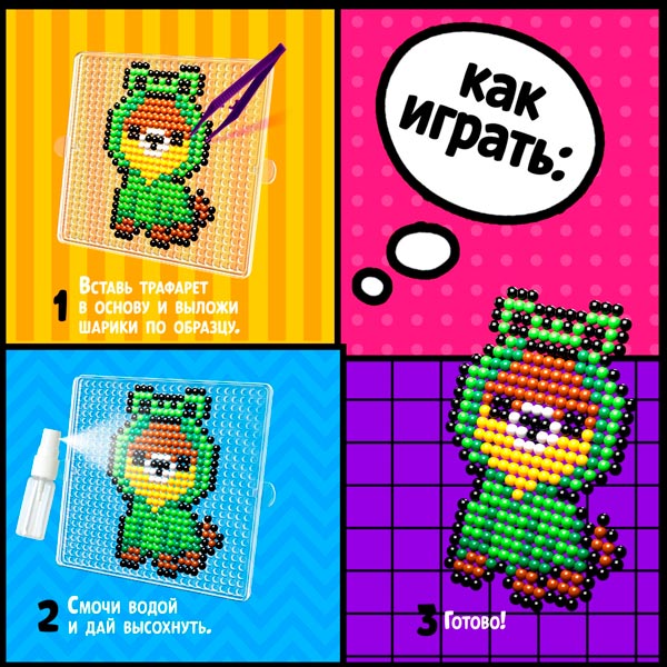 С аквамозаикой "Зверята" ребёнок соберёт 3 объёмные фигурки из шариков-пикселей. Детали плотно скрепляются друг с другом. С поделками можно играть или украсить интерьер.