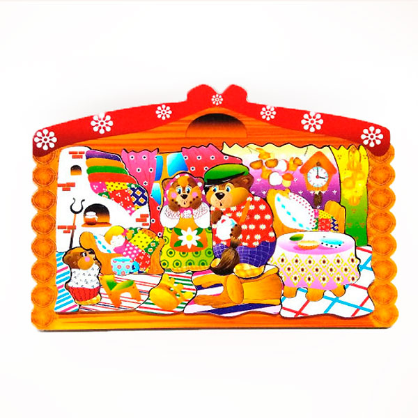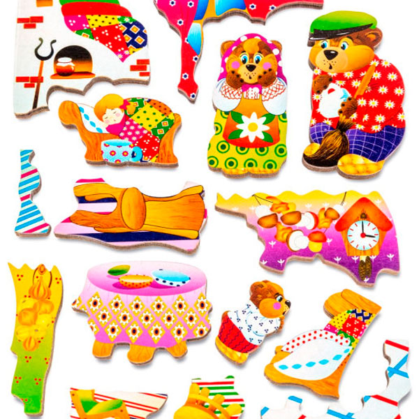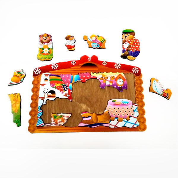 Деревянный пазл с фигурными деталями. Детали пазла фигурные и отличаются формой от стандартных деталей пазла. Пазл собирается внутри рамки, что облегчает процесс сборки для ребенка. Пазл сделан по мотивам русской народной сказки "Три медведя". Игра с таким пазлом головоломкой будет способствовать развитию словарного запаса, логики, мелкой моторики у детей разных возрастов от 1 до 7 лет.