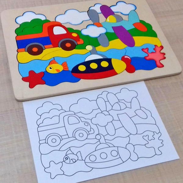 На мозаике изображены разные виды транспорта: наземный, воздушный, подводный. Собирая картинку можно попутно называть составные части машины (кузов, колеса, кабина), самолета (крыло, винт, кабина, корпус), подводной лодки (корпус, люк, перископ).
