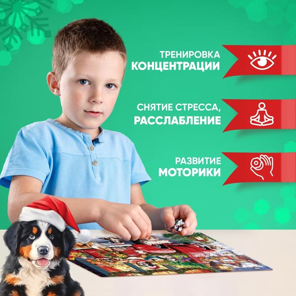 Пазл с новогодним сюжетом — то, что нужно для полезного и интересного досуга! Такой подарок поможет ребёнку скрасить ожидание Нового года, а также потренировать мелкую моторику, внимательность, логическое мышление и память.