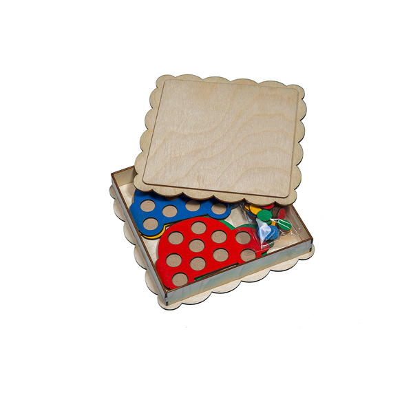 Комплект из 4 деревянных бабочек размером 14*9 см разных цветов (синего, красного, жёлтого и зеленого) и 40 кружков (4 цвета по 10 шт. каждого диаметром 2 см), упакованных в деревянную коробку размером 21*21 см.