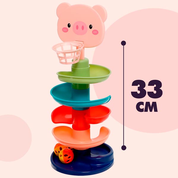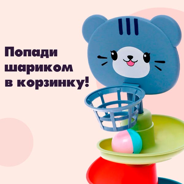 Малыш будет бросать разноцветные шарики в корзинку, и следить, как они скатываются с горки по спирали.
