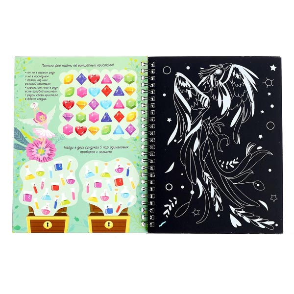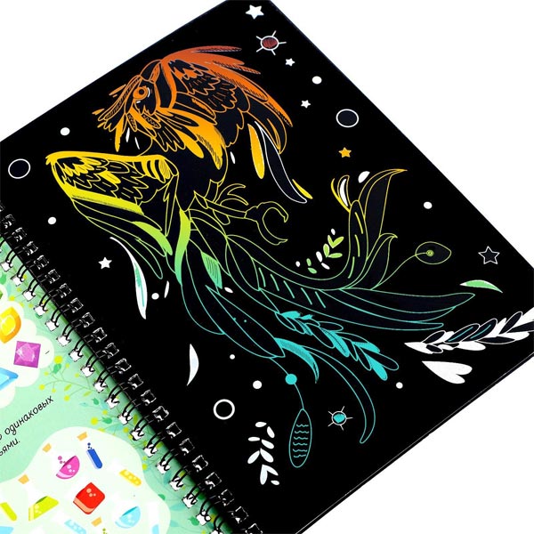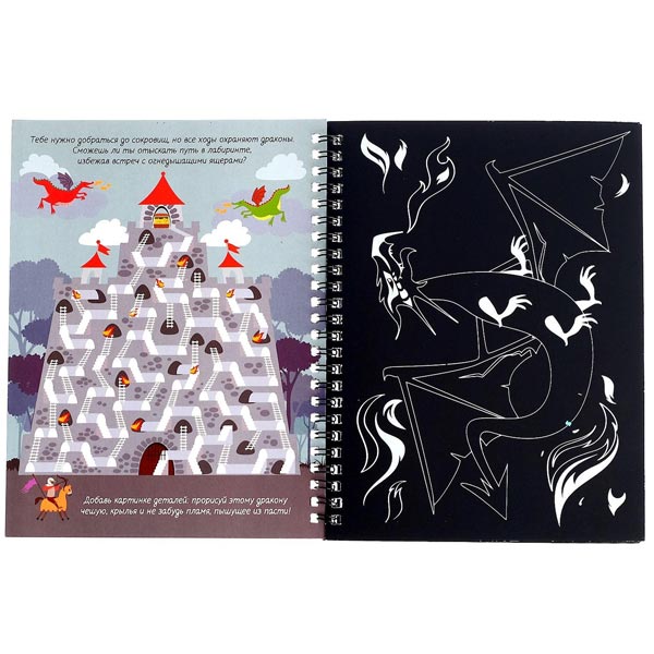 Активити-книга с заданиями "Гравюры. Книга магии", 12 стр. содержит увлекательные задания и волшебные картинки. Чтобы сделать гравюру, нужно просто стирать верхний слой с помощью деревянного штихеля. В книге 5 гравюр. У гравюр пёстрое основание, которое переливается всеми цветами радуги. В книге есть много интересных заданий: лабиринты, логические загадки.