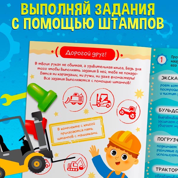 Для работы с такой книгой не понадобятся ни карандаши, ни ручки, ни даже фломастеры. Все задания выполняются c помощью печатей из набора.