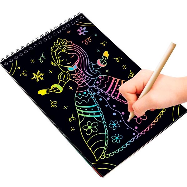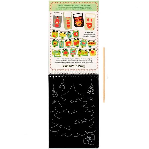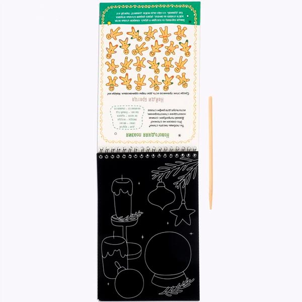 Активити-книга содержит увлекательные задания и волшебные картинки на новогоднюю тематику. Чтобы сделать гравюру, нужно просто стирать верхний слой с помощью деревянного штихеля. В книге 5 гравюр. У гравюр пёстрое основание, которое переливается всеми цветами радуги.