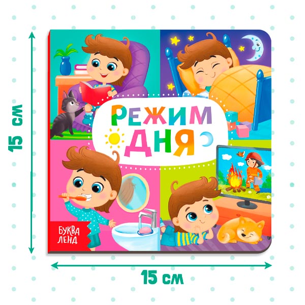 Книга-помощник "Режим дня" в квадратном формате станет первым шагом малыша в освоении распорядка дня. Автор создала яркие иллюстрации с весёлыми стихами, которые помогут ребёнку понять, что утро — это время для зарядки и чистки зубов, день — для прогулок, а вечер — для отдыха. Твёрдый переплёт и 10 страниц из плотного картона делают книгу идеальной для детей с первых месяцев жизни.