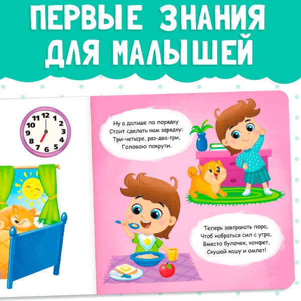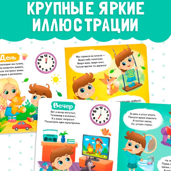 - Весёлые стихи и простые сюжеты учат малыша последовательности действий в течение дня.
