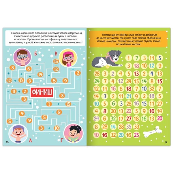 На каждой страничке есть разные задания: решить пример и пройти лабиринт, помочь щенку добраться до косточки по кружочкам с нечётными числами и пр.