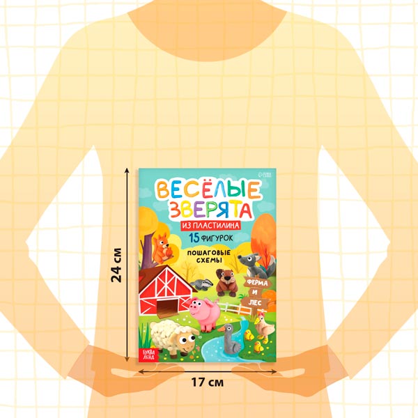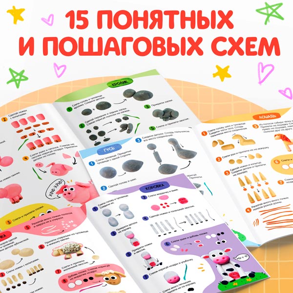 Шаг за шагом с помощью ярких иллюстраций и подробных схем дети создадут 15 забавных фигурок животных из пластилина.