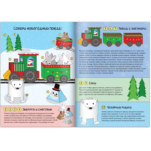 С книгой вы сможете вместе с ребёнком смастерить новогодний экспресс со сказочными пассажирами. Внутри вы найдёте заготовки для 10 праздничных поделок.