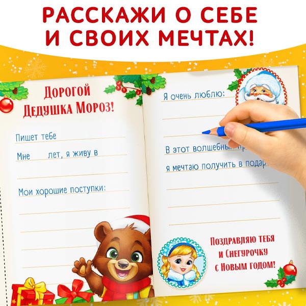 С этой книжкой малыш напишет письмо Дедушке Морозу. Пусть ребёнок пофантазирует вместе с милым дракончиком, который принесёт ему удачу в новом 2024 году!