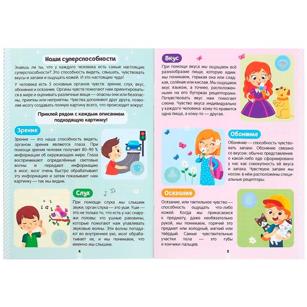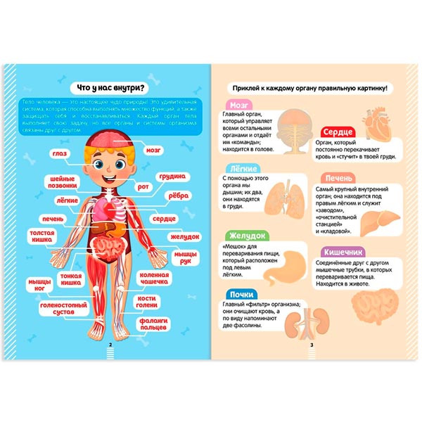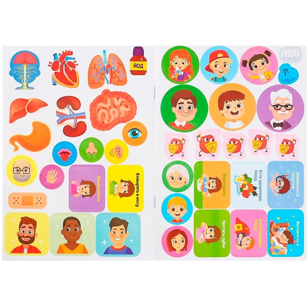 Серия книжек с наклейками познакомит малышей с человеческим телом. Занимаясь с этой книгой, ребёнок узнает, как работают разные органы и системы. А закрепить знания помогут весёлые и интересные задания: их нужно выполнить с помощью наклеек.