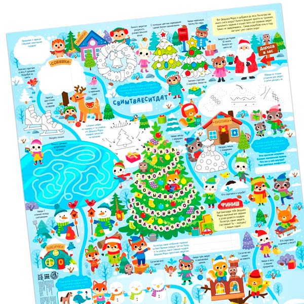 Большой Новогодний плакат размером 59х84 см. Выполнятйте новогодние задания и помогайте Деду Морозу раздать подарки лесным обитателям.