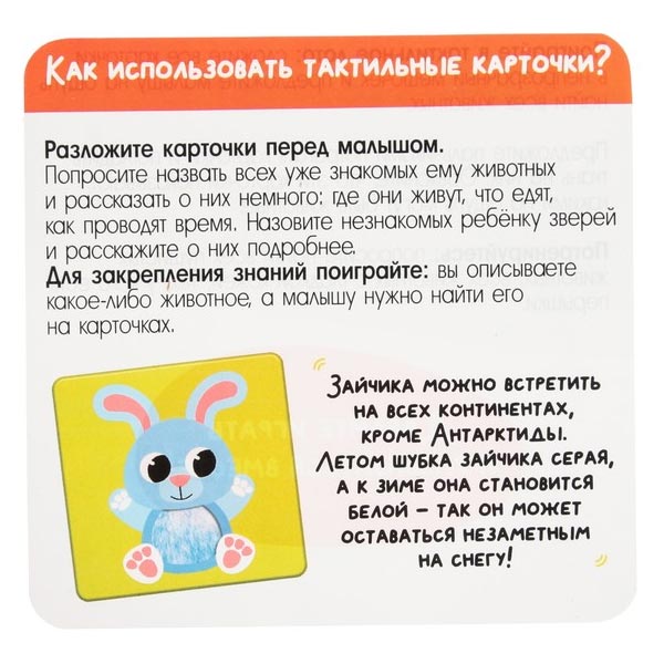 В этой необычной игре есть множество тактильных элементов на карточках с животными. Они представлены вкладками, соответствующими поверхности тела каждого зверька.