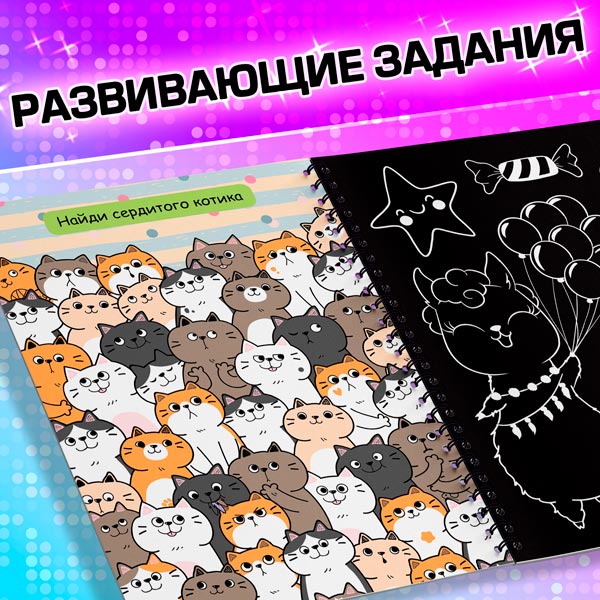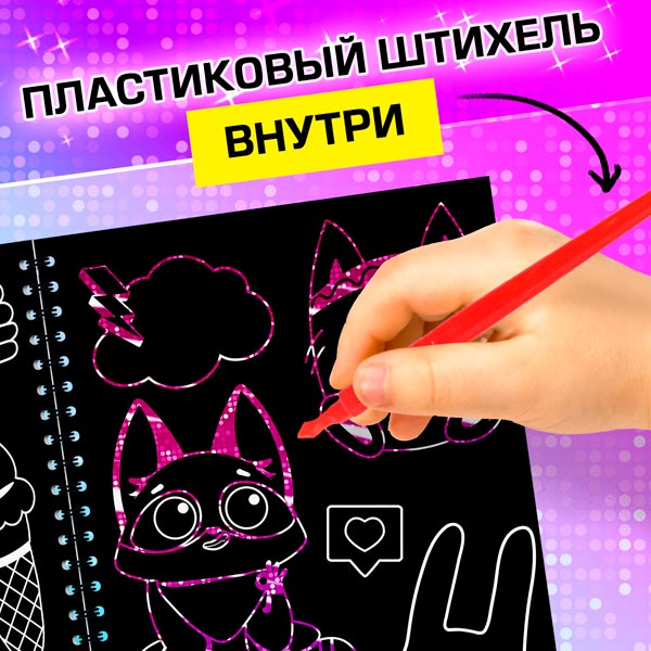 Как создать гравюру? Чтобы сделать гравюру, нужно просто стирать верхний слой с помощью пластикового штихеля, который входит в набор. В книге вы найдёте 10 гравюр и интересные задания "найди и покажи". У гравюры голографическая основа, которая переливается разными цветами.