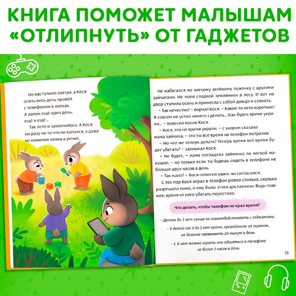 - Книга научит вашего малыша правильно обращаться с гаджетами и подскажет, как не попасть в зависимость от устройств.