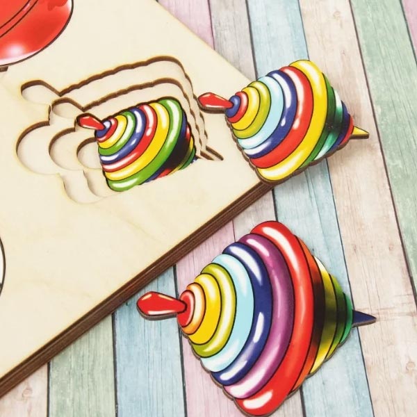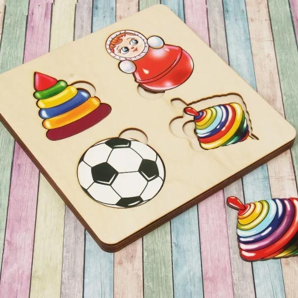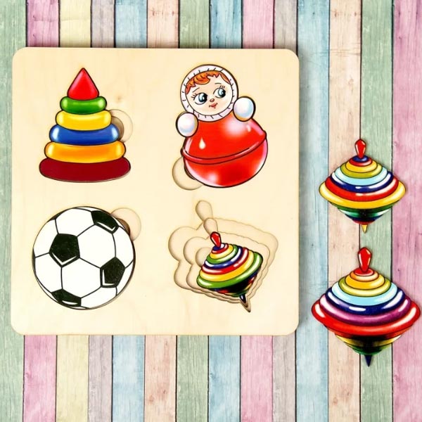Для того, чтобы вкладыши было удобнее вынимать из основы, сделаны специальные выемки. Не все игрушки одного вида нарисованы одинаково: у мячиков разная расцветка, у пирамидок с увеличением размера добавляются колечки. Благодаря этому ребенок понимает, что одинаковые по названию предметы необязательно должны выглядеть идентично.