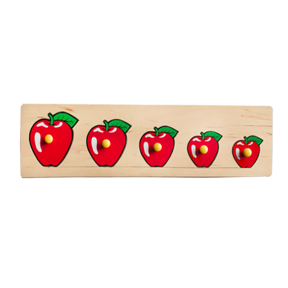Деревянный планшет размером 29,5х9,5 см из серии «от большого к меньшему», на котором размещены 5 вкладышей в виде яблок с ручками-кнопочками. Вкладыши уменьшаются в размерах от большего к меньшему в направлении слева направо. Логическая разборная доска-вкладыш помимо развития мелкой моторики поможет сформировать у малыша представления о величине и количестве, научит его осмысленно употреблять слова "большой", "маленький", "средний", "самый маленький", "самый большой", "больше чем", "меньше чем".