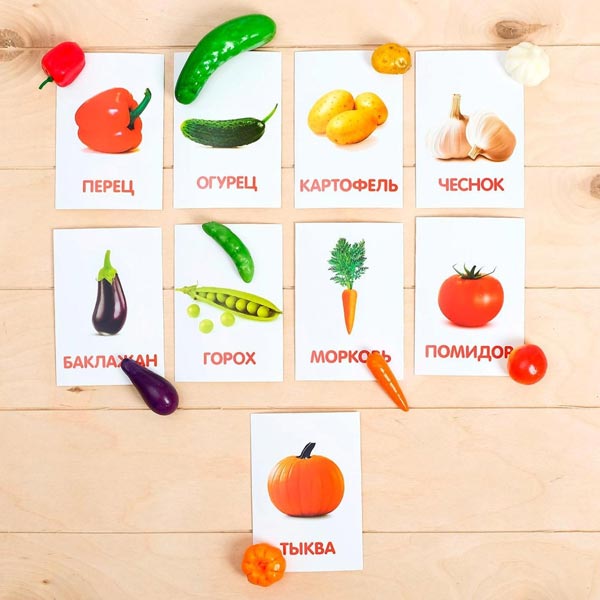 - Показывайте карточки малышу несколько раз в день, проговаривайте названия изображённых овощей.