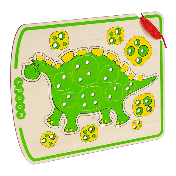 Шнуровка "Шнурозаврик" представляет собой деревянную панель размером 22,5х13х1 см. с шестью пятнышками и шнурком. Когда Шнурозаврик радуется, он покрывается жёлтыми, как солнышко, пятнышками. Предложите вашему малышу следующие задания: привяжи шнурком пятна Шнурозаврику, сосчитай пятнышки, найди 3 одинаковых, разложи различные по размерам пятнышки от большего к меньшему, свяжи их шнурком в пирамидку.