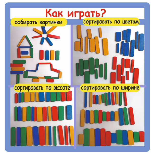 Деревянный набор, состоящий из планшета размером 17,5 х 24 см и 36 палочек разных цветов и размеров. Самые маленькие детки могут сортировать палочки по цветам (красные, желтые, синие, зеленые), по высоте (высокие и низкие) и по толщине (широкие и узкие). Малышам постарше предложите выкладывать из палочек силуэты геометрических фигур, а затем сравнить по величине полученные квадраты. Детки также могут выкладывать изображения различных предметов: домика, стола, кораблика и т.д. Научите ребенка работать по устной инструкции: например, построить крышу домика из четырех палочек; сделать квадратное окно из четырех палочек и т.д.