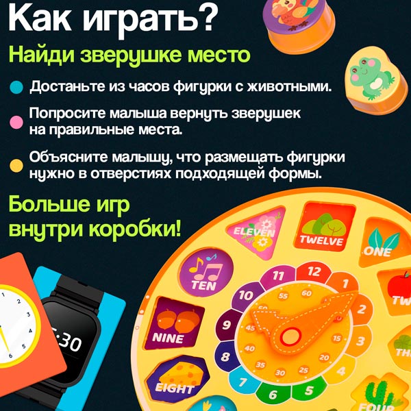 Развивающая настольная игра "Часы-сортер" с фигурками животных станет замечательным подарком для малыша от 3 лет. Это не просто игрушка, целый комплекс заданий, направленный на развитие внимания, логики и моторики. В игровой форме малыш познакомится с базами счёта, научится различать формы и цвета.